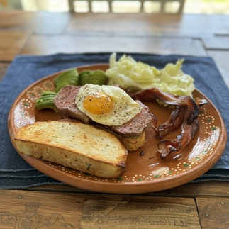 What you see is what's in it. 3 Eggs, sunny side up, with melted cheese, beans, sour cream, salsa, shredded cheese, cilantro and whatever hot sauce you like. Most use tortillas instead of toast, but this worked for me.